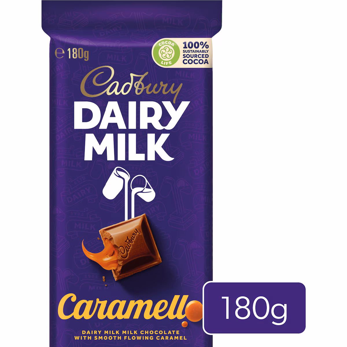 Cadbury Dairy Milk Caramello features Dairy Milk milk chocolate with smooth flowing caramel. A well-loved and trusted flavour combination of delicious smooth and creamy milk chocolate with rich flowing caramel. The equivalent of a glass and a half of full cream milk in every 200g of Cadbury Dairy Milk milk chocolate. Cadbury Dairy Milk chocolate blocks are proudly made in Tasmania.