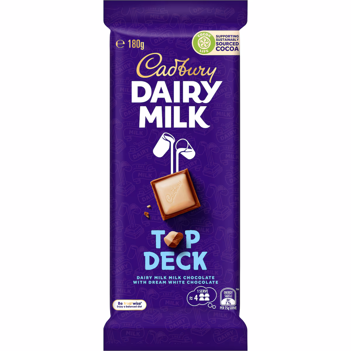 Our family sharing chocolate block of Cadbury Dairy Milk Top Deck is the best of both worlds, Cadbury Dairy Milk milk chocolate and Dream white chocolate. A smooth & creamy combination that is sure to please any crowd. Cadbury Dairy Milk chocolate blocks are proudly made in Tasmania. Cadbury Dairy Milk milk chocolate and Dream white chocolate are made with the equivalent of a glass and a half of full cream milk in every 200g. Supporting sustainably sourced cocoa. Cadbury believes that tasting good and doing good should go hand in hand. The cocoa life program aims to improve the livelihoods of farming communities and the landscapes where cocoa grows.