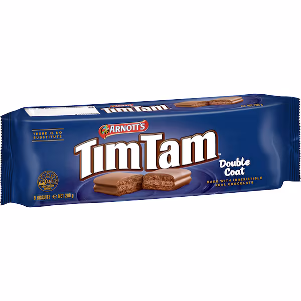 Arnott’s Tim Tam Double Coat is a delicious biscuit with a mouth-watering combination of crunchy biscuit, luscious cream centre, wrapped in a thicker milk chocolate coating .